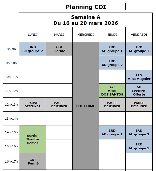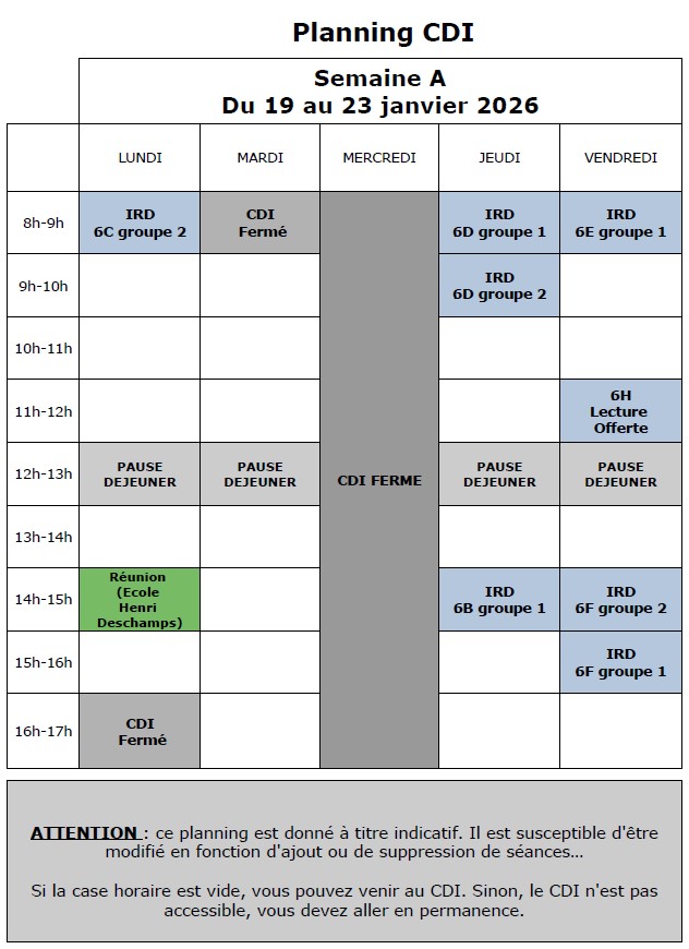 Vous trouverez ici le planning d'ouverture du CDI pour la semaine à venir